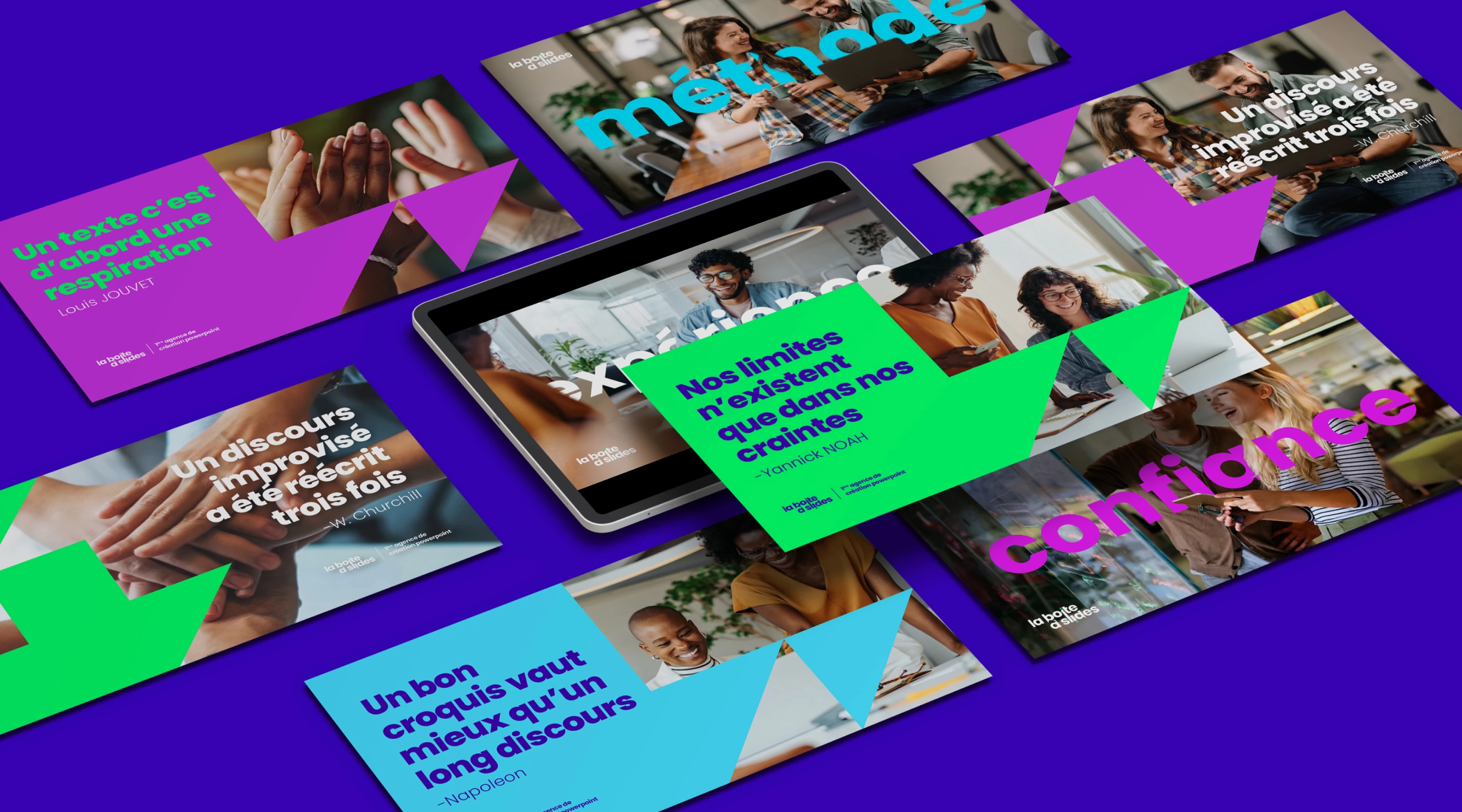 Nous avons fait des ateliers pour co-construire de nouveaux claims et une identité peps et facile à utiliser. Côté claims, l'humour a été notre fil rouge, en s'appuyant sur des citations amusantes de personnalités. Notre préférée : "Un discours improvisé a été réécrit trois fois" (W. Churchill)