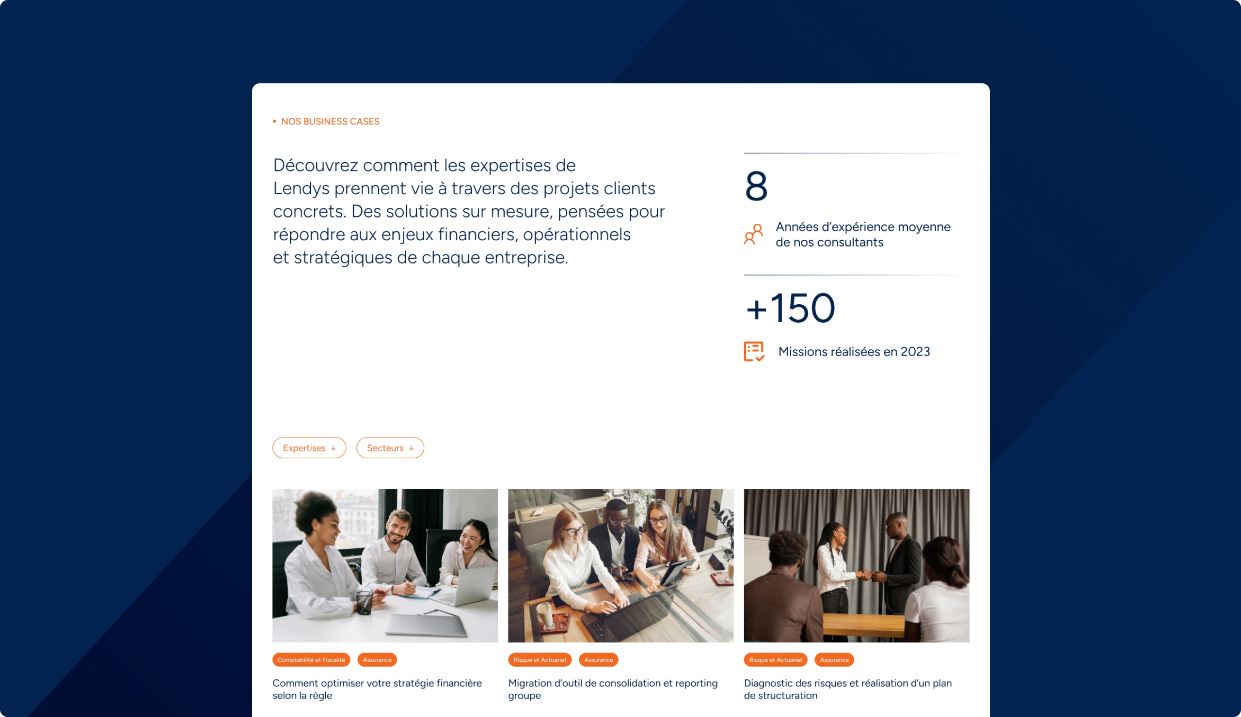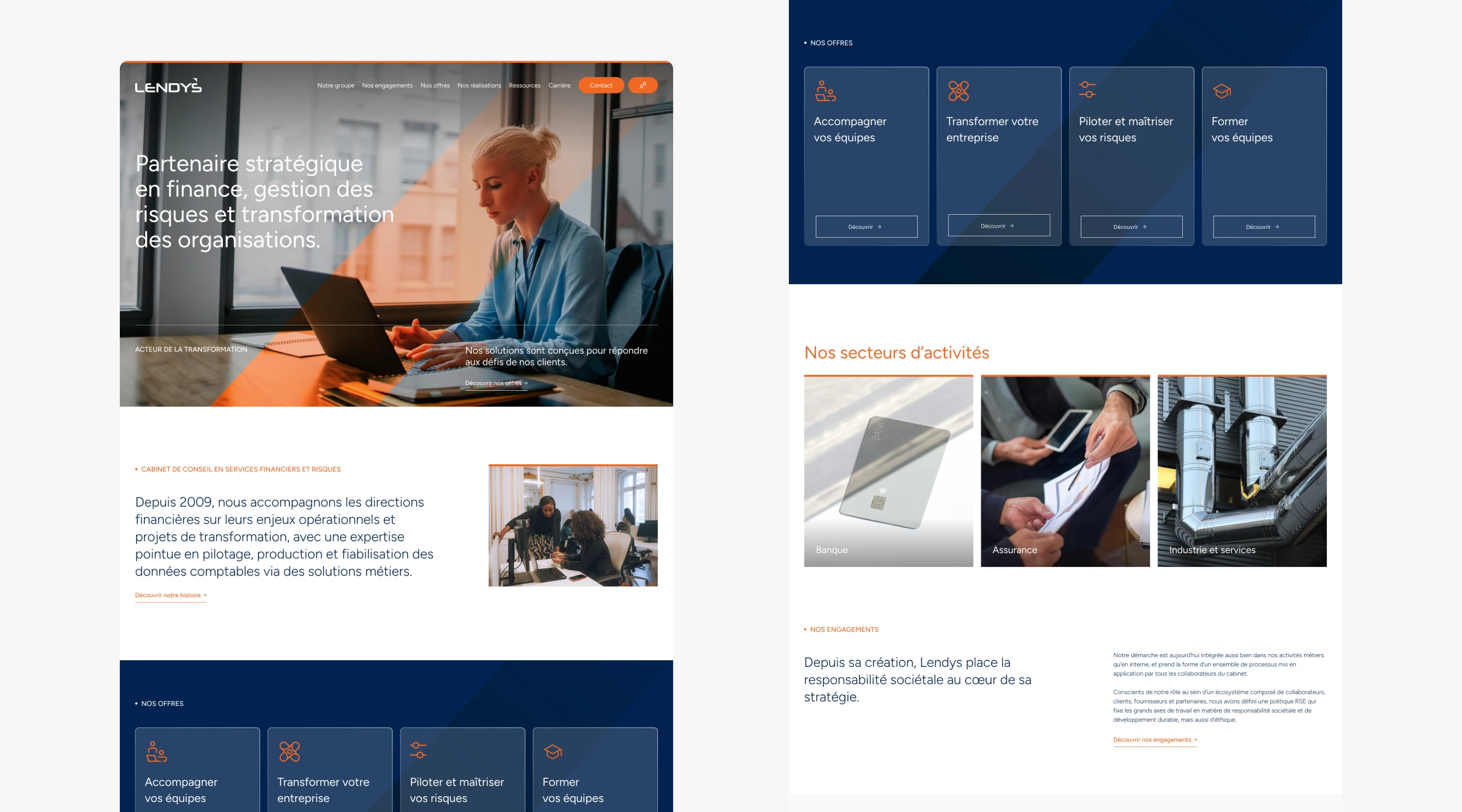 Nous avons travaillé avec les équipes Lendys pour faire émerger une expression claire et équilibrée des trois pôles clés : banque, assurance et industrie. Notre priorité : donner au pôle industrie la place stratégique qu’il occupe désormais, tout en conservant l’ADN du cabinet et son exigence de rigueur opérationnelle.