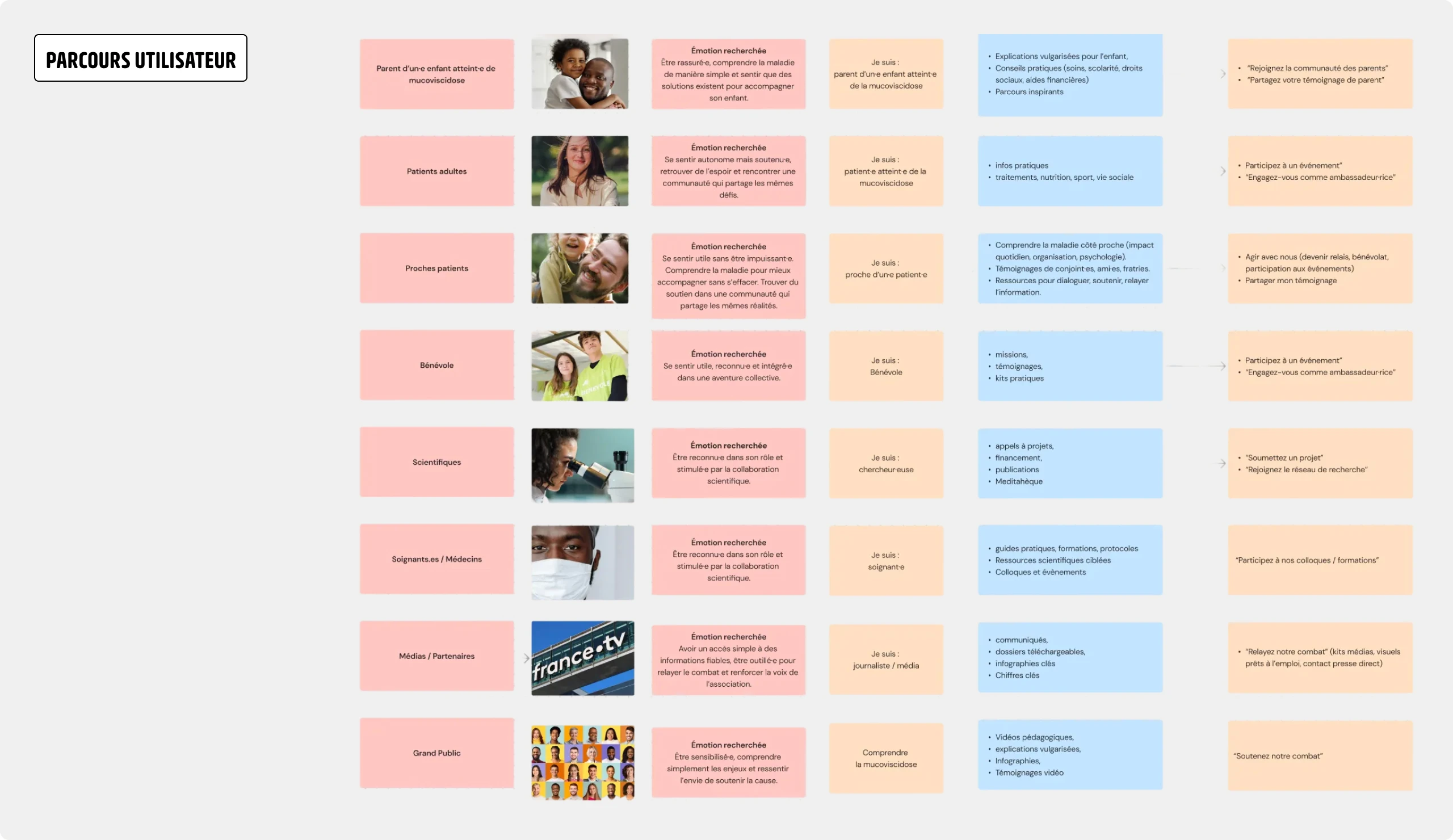 A partir de ce travail, nous proposons dans la réponse à l’appel d’offres un userflow complet, pensé “par et pour” les profils, avec une logique d’engagement forte. L’entrée s’adapte au profil (patient, parent, proche, bénévole, donateur/adhérent, partenaire, chercheur, soignant, média, institution), et sert de porte d’accès à une architecture de contenus et à des parcours qui transforment la visite en action (don, bénévolat, participation, relais, témoignage).