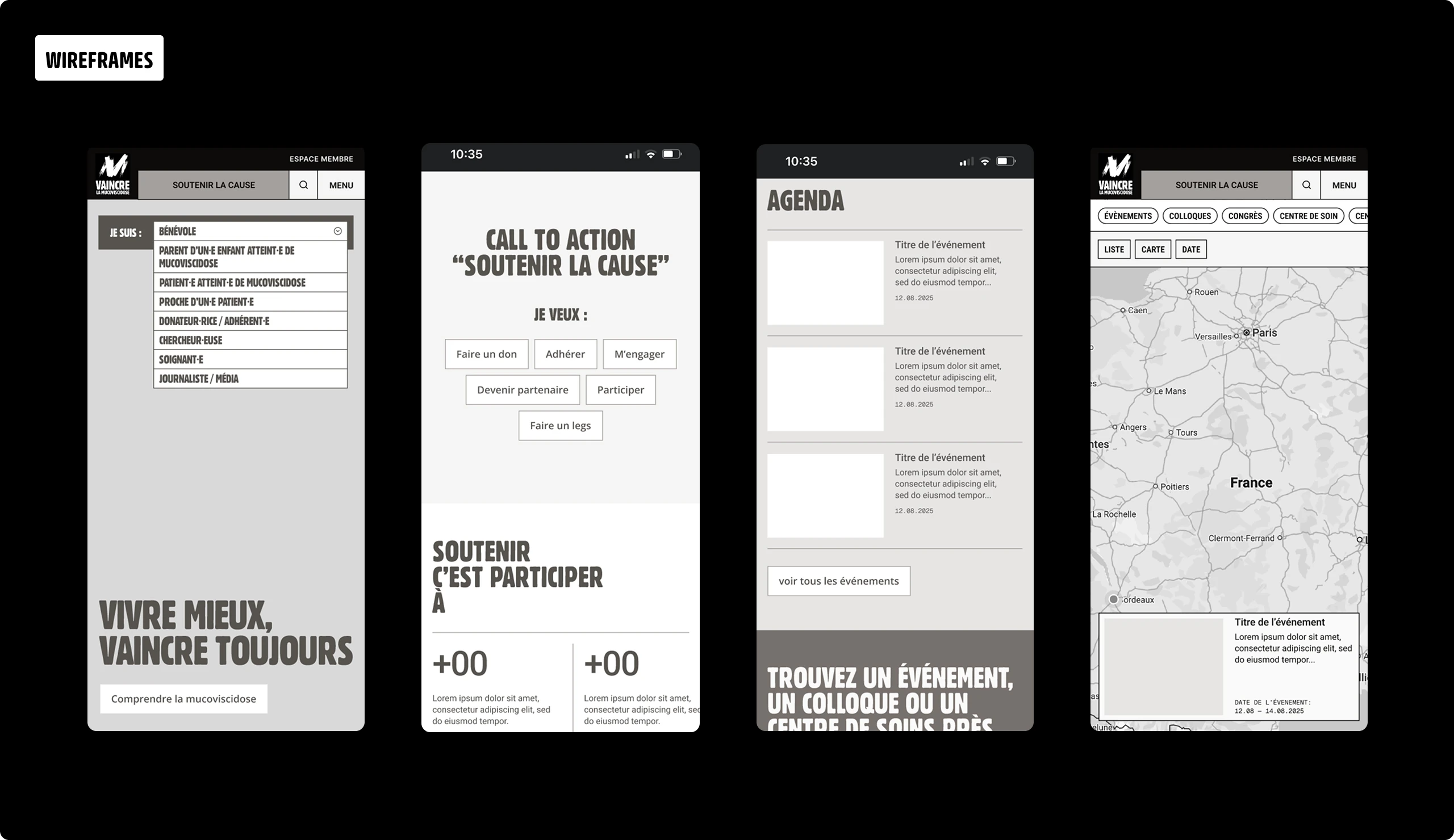 Pour valoriser notre approche stratégique, conceptuelle, structurelle et graphique, nous présentons des livrables de conception, wireframes, arborescence, éléments de navigation (menu et son ordre logique), et des maquettes (homepage, page profil, parcours don), pour donner à voir le futur site et permettre de valider les arbitrages UX/UI.