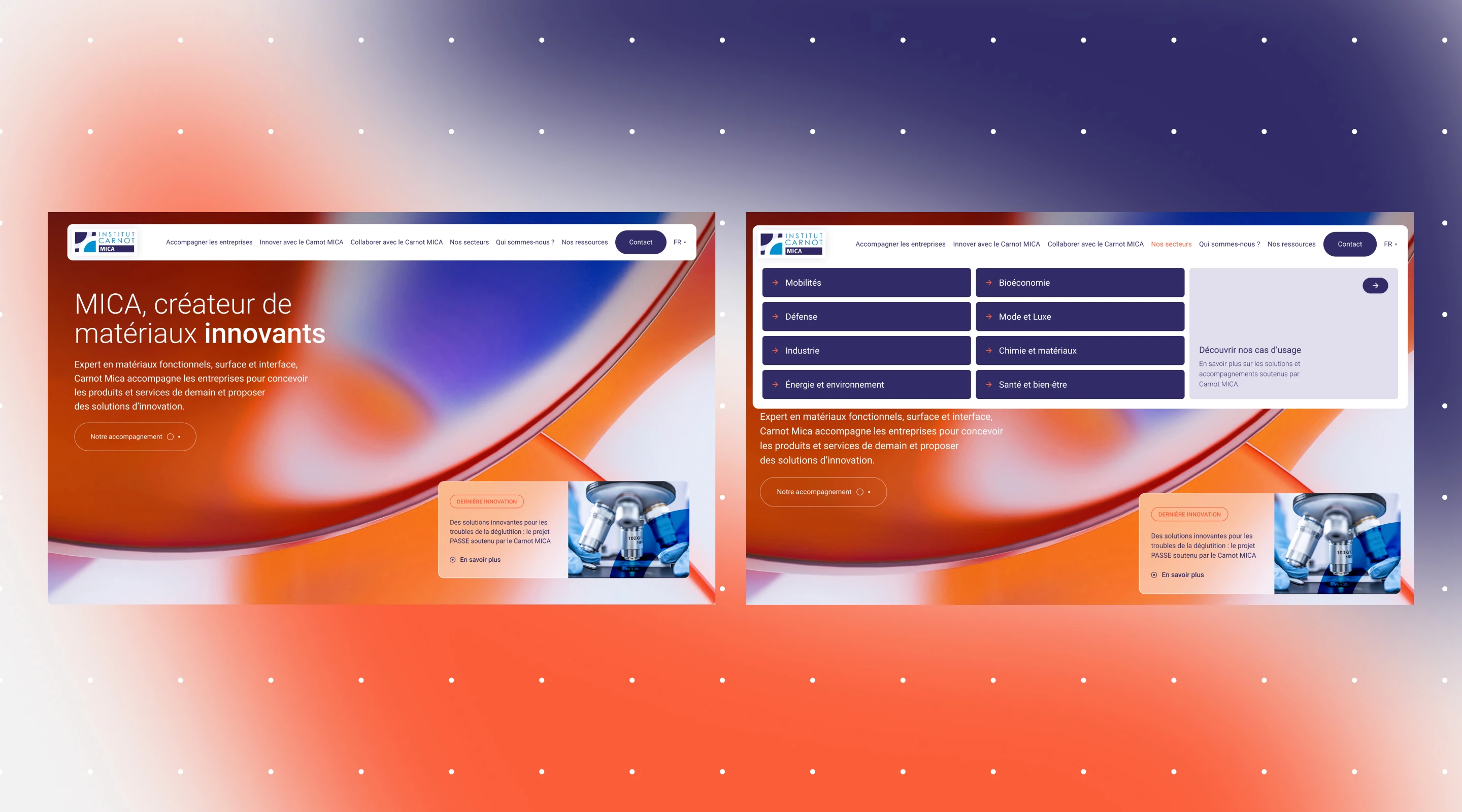 Carnot MICA brings together public research laboratories specializing in innovative materials, addressing some of today’s most advanced industrial challenges. At the intersection of academic research and technological innovation, the network supports companies on complex issues that are often difficult for non-specialist audiences to grasp. Its website no longer made this added value clear, nor did it adequately reflect the network’s ability to support economic players in a concrete way.