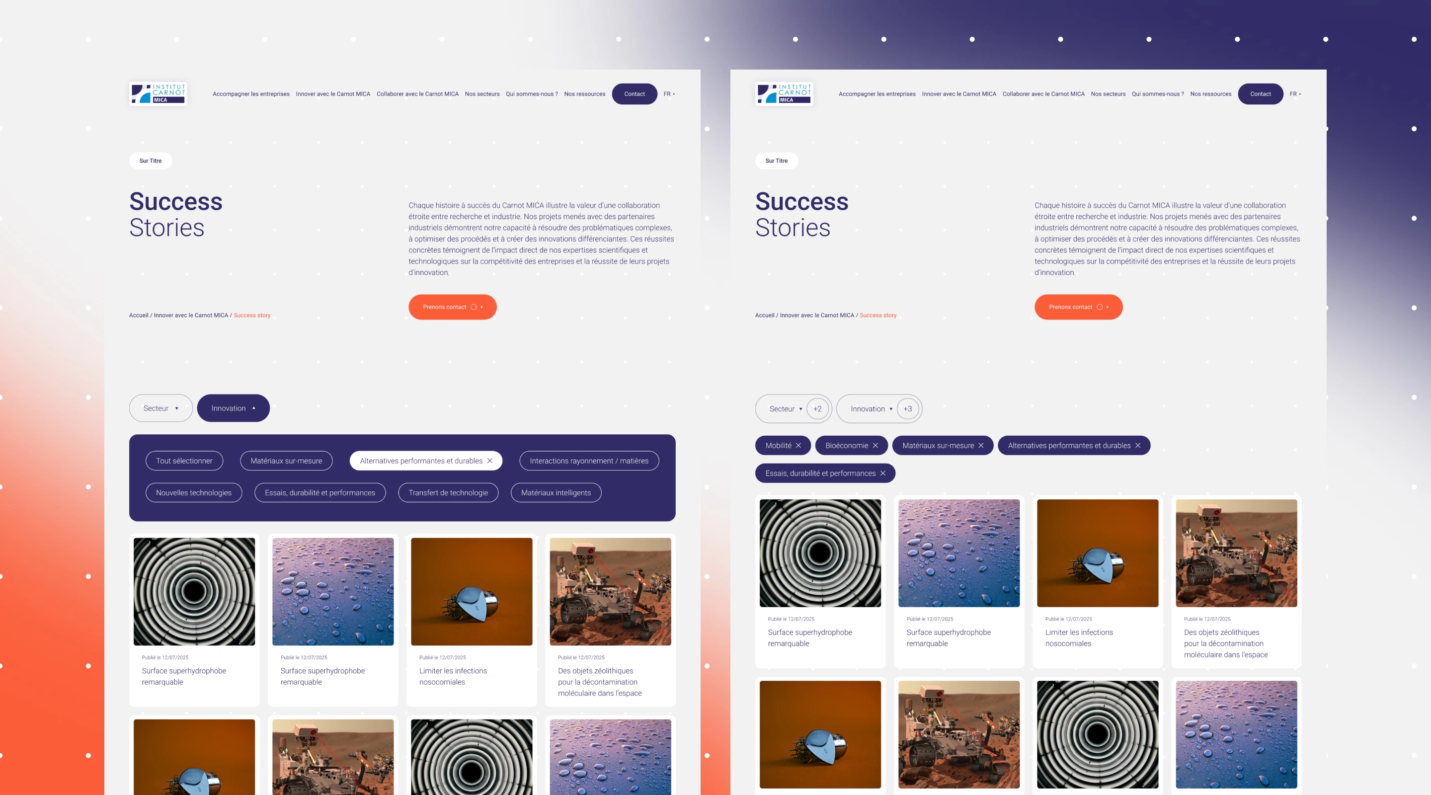 148 Agence Collective supported Carnot MICA in a complete website redesign, conceived as a true exercise in scientific mediation. Information hierarchy was central to the approach: clarifying areas of expertise, structuring content around uses and benefits, and highlighting how the network supports companies. The UX work with SEO strategy made it possible to build progressive reading paths, facilitating understanding of the network’s activities while also addressing visibility and SEO challenges in highly technical scientific fields.